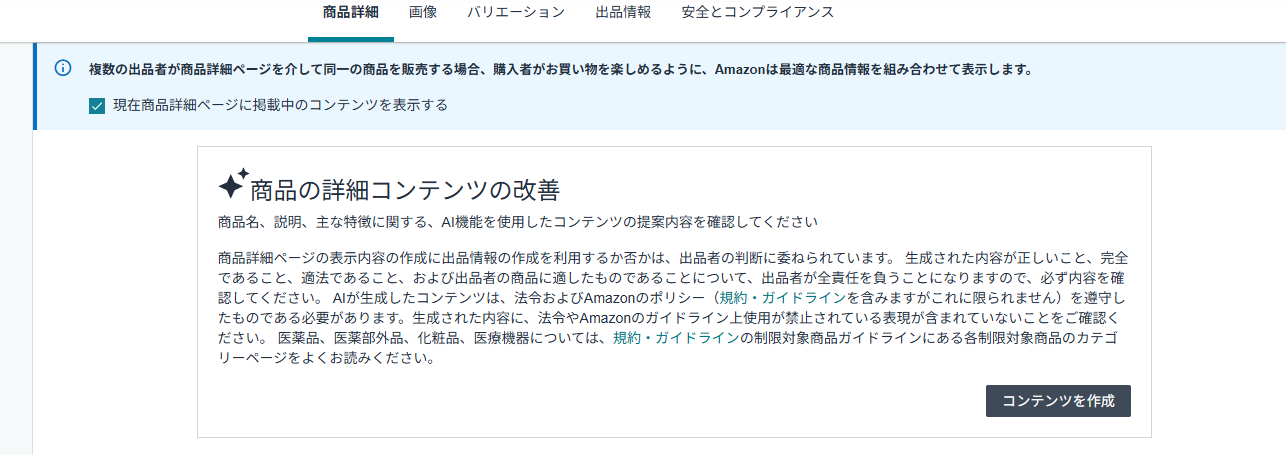 商品の詳細コンテンツの改善でコンテンツの作成をクリックすると、AIが欠落している情報を自動で入力してくれます。
