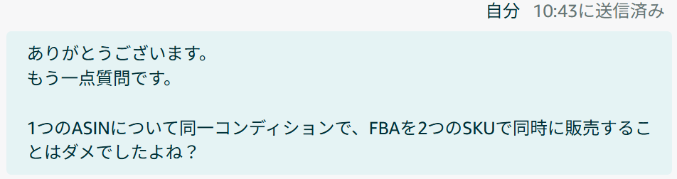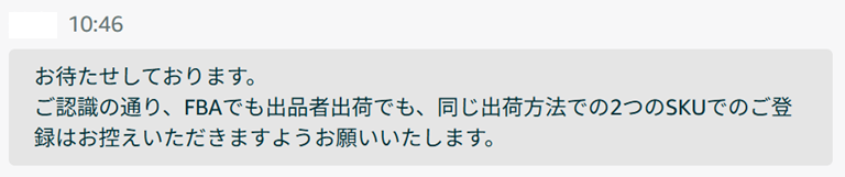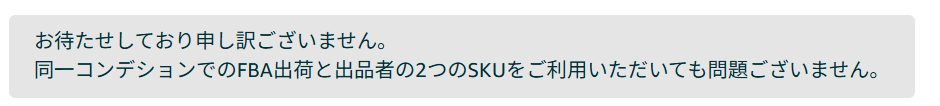 FBA出荷と出品者出荷(自己発送)について、2つのSKUを利用して同時に販売しても問題ないとのこと。