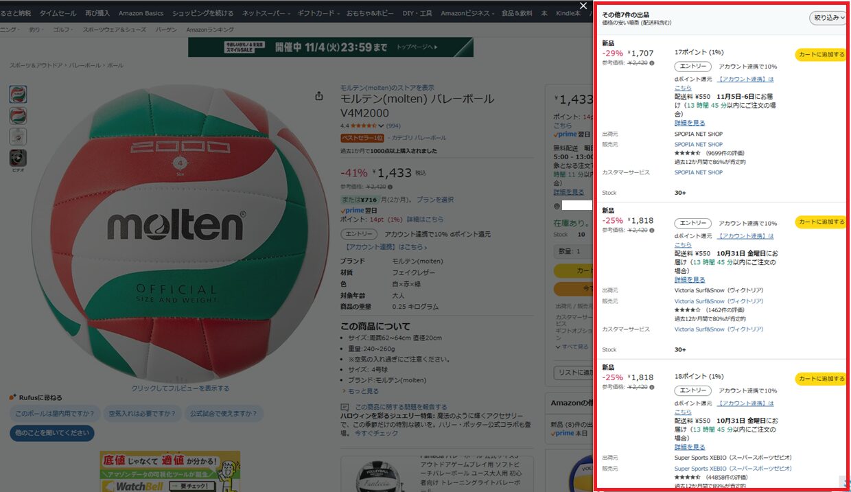 SKUを複数登録して同時にたくさん出品すれば、下記画像の出品者一覧(赤枠)のところにたくさん自分の店舗名が並び、想像ですが露出も増えて売れ行きもカート所得率も上がると思います。
