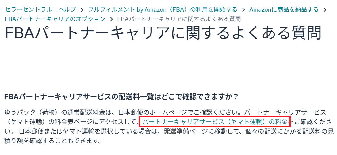 運賃に関しては納品プランを作成し、発送準備ページで確認できますが、事前にわかる料金表なるものがないのか調べたところ、FBAパートナーキャリアに関するよくある質問のところにありました。