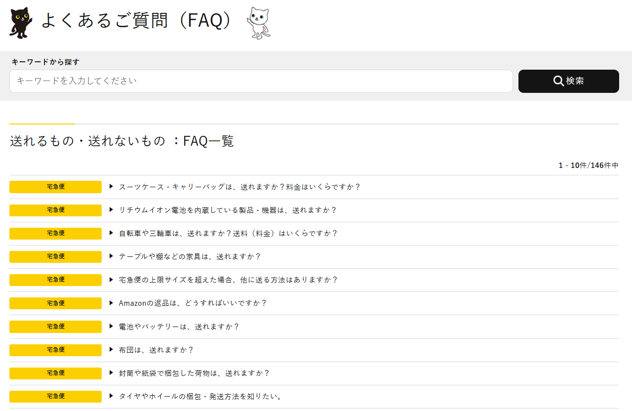 ヤマト運輸では「送れるもの・送れないもの :FAQ一覧」があるので、ここで確認できます。