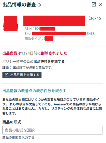 承認が必要な出品情報を確認するについては、出品商品は削除されていて、出品許可申請が必要とのことでした。