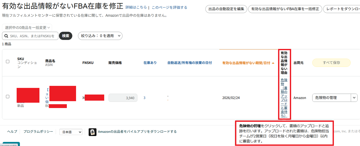 有効な出品情報がないFBA在庫を修正については、FBA納品した商品が危険物審査するので、書類をアップロードしてほしいとの話でした。