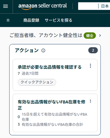私の場合は、承認が必要な出品情報を確認する、有効な出品情報がないFBA在庫を修正と2つアクションとしてあがっていました。