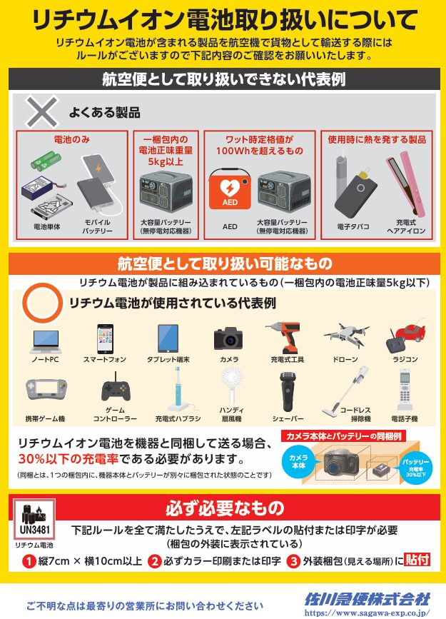- 航空便:電池のみ単体はNG、規定以上の商品NGなど